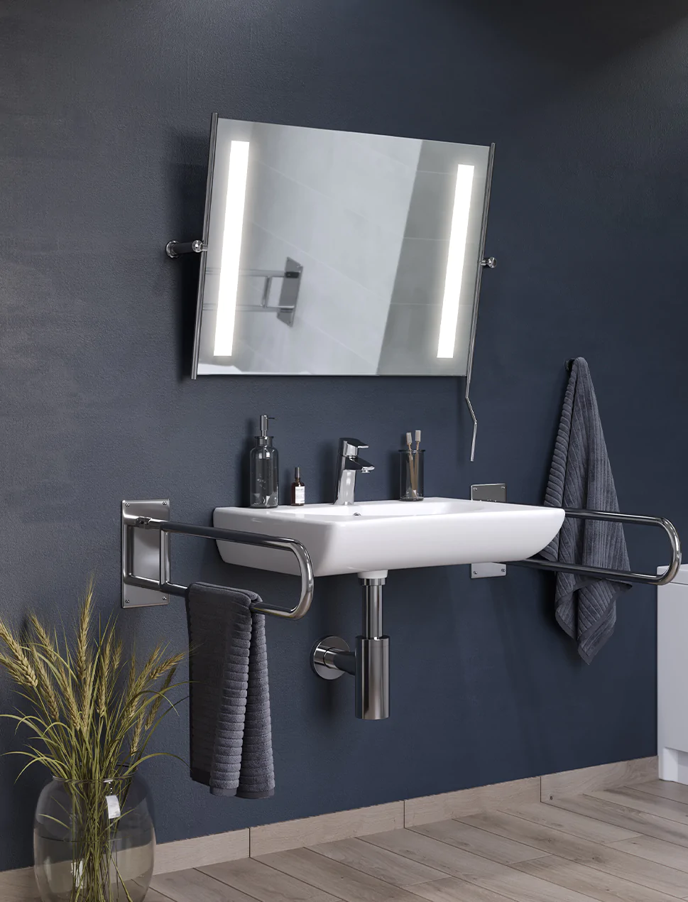 Die Med Line Kollektion umfasst kippbare LED-Badspiegel, die Komfort, Sicherheit und Benutzerfreundlichkeit bieten. Dank ihrer stabilen und langlebigen Konstruktion sind sie ideal für Menschen mit eingeschränkter Mobilität und zugleich komfortabel für jeden Badnutzer. RUKE-Spiegel stehen für hochwertige Verarbeitung, durchdachtes Design und zuverlässige Funktionalität.